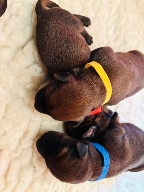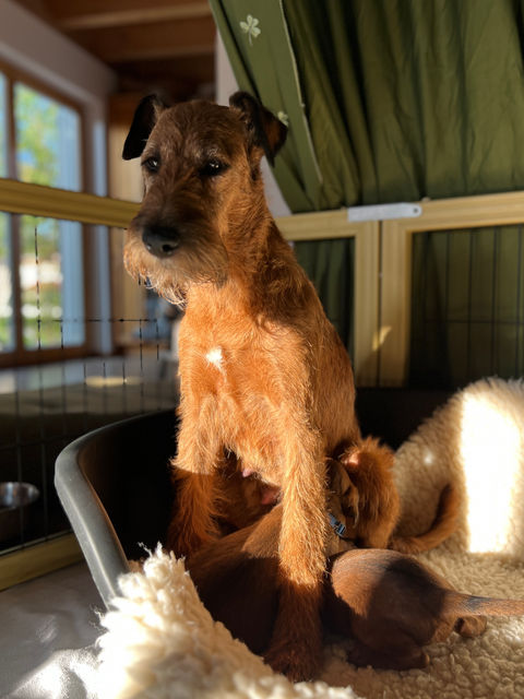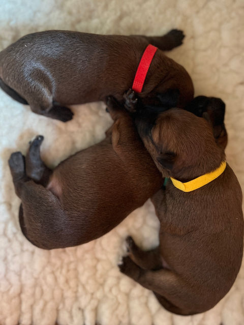 Pünktlich zum errechneten Termin haben wir mit Irmchen einen unruhigen Tag, als sich die Kleinen auf den Weg gemacht haben. Ab 23:00 Uhr hat sie schließlich in kurzen Abständen ihren dritten Wurf zur Welt gebracht. Mit Ausnahme eines kleinen Rüden, der leider nicht überlebt hat, waren alle Welpen kräftig und munter bei sehr ordentlichen Geburtsgewichten. Bei allen ist das Fell glatt und von einem satten Dunkelrot. Wie die Mutti, haben alle einen kleinen weißen Stern auf der Brust.