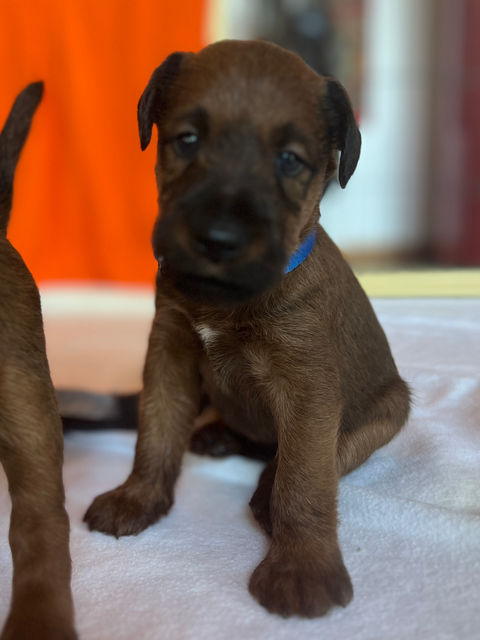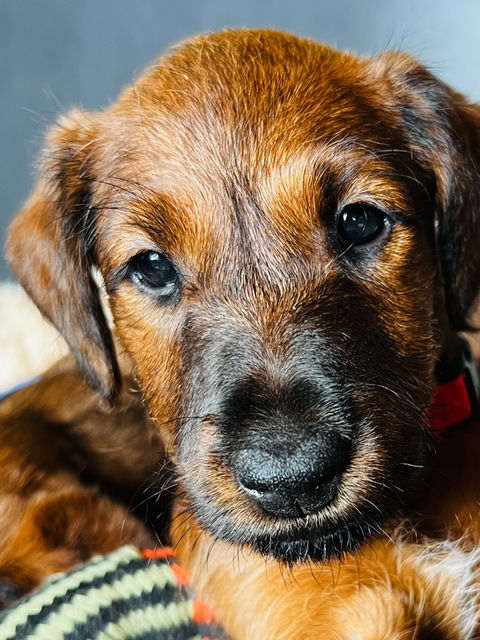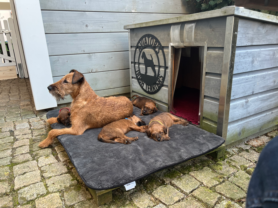 Gleich zu Beginn dieser Woche hatten wir Besuch vom Zuchtwart zur Wurfabnahme. Er war sehr zufrieden und hat festgehalten, dass die Kleinen alles haben, was so ein kleiner Irish Terrier haben soll und auf ihn einen sehr ausgeglichenen Eindruck gemacht haben.