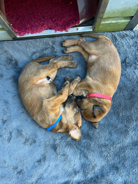 Mitte Mai 2025 durfte unser Irmchen wieder "Hochzeit feiern". Wie schon beim B-Wurf, machten wir uns auf den Weg ins Saarland zu einem Deckrüden aus der Zuchtstätte Caramel´s. Da der B-Wurf ausgesprochen gelungen war, sollte es diesmal der unglaublich charmante "Yoshi" sein, ein Halbbruder von "Connor", dem Vater unseres B-Wurfs. Irmchen war dann auch recht schnell von ihrem sanften Kavalier überzeugt. Die Ultraschall-Untersuchung nach der Hälfte der Tragzeit brachte das ersehnte Ergebnis: Jawohl, der Weg ins Saarland war wieder erfolgreich gewesen! Die Trächtigkeit verlief auch bei Irmchens dritten Wurf ganz und gar problemlos. Noch bis kurz vor dem Wurftermin war sie sogar so fit, dass sie unbedingt mit Tim und Bienchen am Dogscooter laufen wollte, was wir ihr aber leider nicht erlauben konnten.